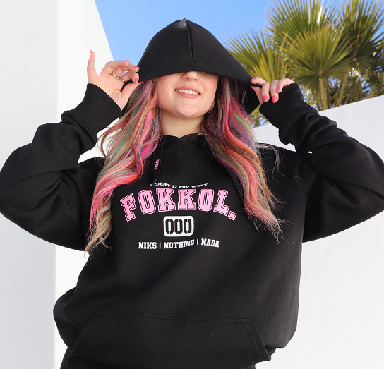 Step into casual elegance with the Unisex Hoodie Swart Varsity Pienk from fOKKOL merch, a blend of sporty charm and contemporary style. Crafted from premium cotton, this hoodie offers a cozy yet breathable feel, making it perfect for year-round wear. The bold “Swart” black base is accented by vibrant “Varsity Pienk” pink detailing, including sleeve stripes and a hood lining, adding a touch of athleticism and modern flair. Featuring a kangaroo pocket and ribbed cuffs and hem for added comfort and warmth, it strikes the ideal balance between functionality and fashion-forward design. Whether worn with jeans for a laid-back look or layered over activewear, this hoodie ensures comfort and standout style.