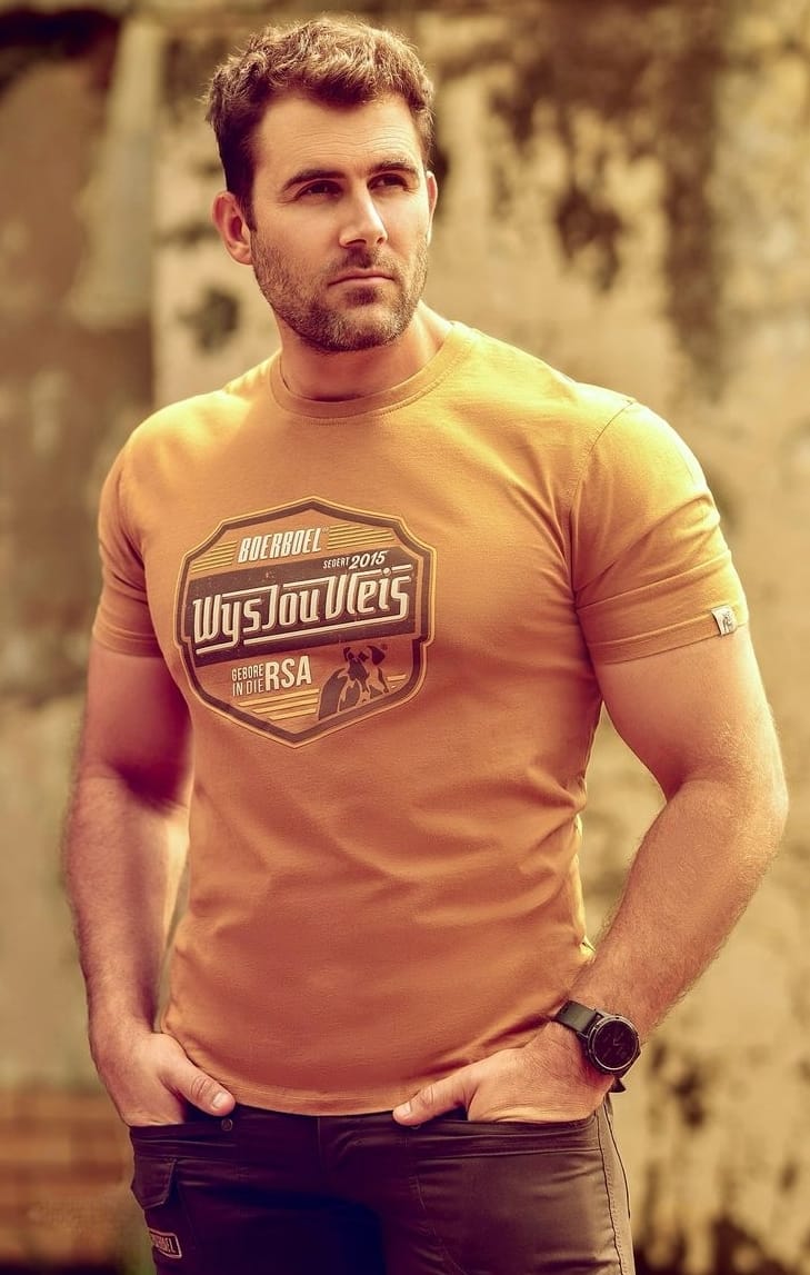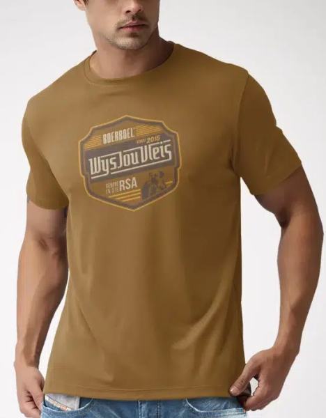 Infuse your wardrobe with humor and style with Boerboel Wear’s Men’s Premium Cotton T-Shirt in Printed Camel “Wys jou vleis”. Crafted from high-quality cotton, this t-shirt offers a soft and breathable feel, ensuring comfort throughout the day. The camel color adds warmth and versatility, making it a staple for casual outings. The “Wys jou vleis” print on the front adds a playful and humorous element, reflecting a sense of fun and personality. Designed with a classic crew neckline and short sleeves, it provides a relaxed fit that enhances ease of movement. Whether paired with jeans for a laid-back look or under a jacket for a casual yet polished ensemble, this t-shirt adapts effortlessly to various styles. It features durable stitching for long-lasting wear and maintains its shape and color wash after wash. Easy to care for with its machine-washable fabric, it combines practicality with lighthearted charm. Embrace comfort and individuality with this essential piece from Boerboel Wear.